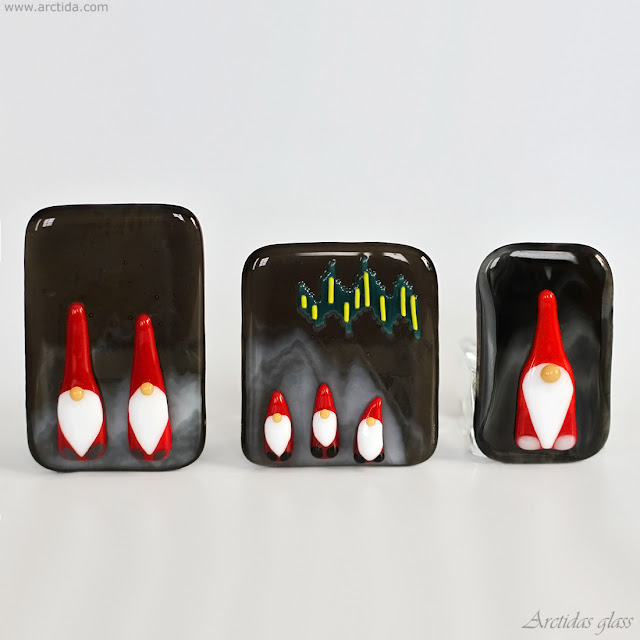 Handmade Christmas gnomes (jultomtar) tea light holder made of fused glass ❤️ These cuties have dark background, inspired by the polar nights here in the Northern Sweden.